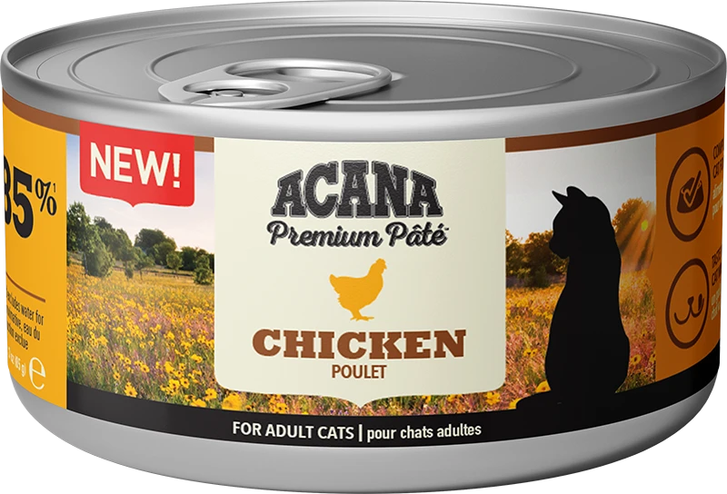 ACANA Premium Pâté is crafted with high-quality animal ingredients and comes in 6 delicious recipes that will satisfy your feline. Our Chicken recipe is an animal protein-rich pâté crafted to completely satisfy your feline. Its premium animal ingredients and bone broth provide the quality nutrition your cat needs to live its fullest life.
