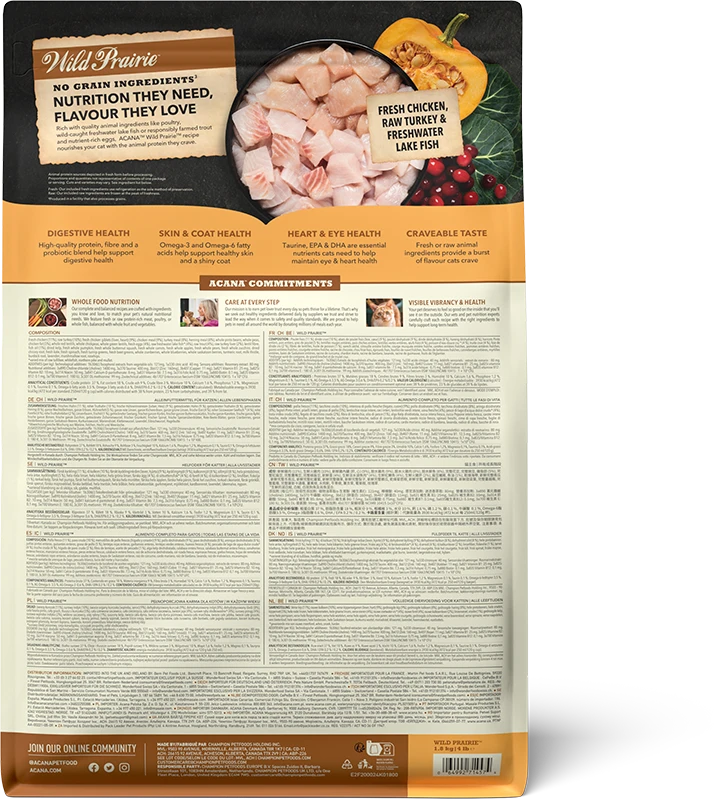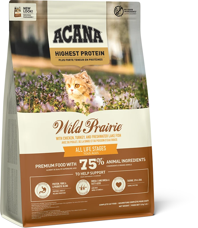 ingredients. Inspired by our vast prairies and pristine lakes, ACANA Wild Prairie offers your cat quality animal ingredients from free-run chicken and turkey, freshwater fish, and cage-free eggs. Protein-rich and nutrient-dense, ACANA includes WholePrey ratios of meat, organs, cartilage, and bone, so your cat is getting everything they need for peak health, keeping them happy, healthy, and strong.