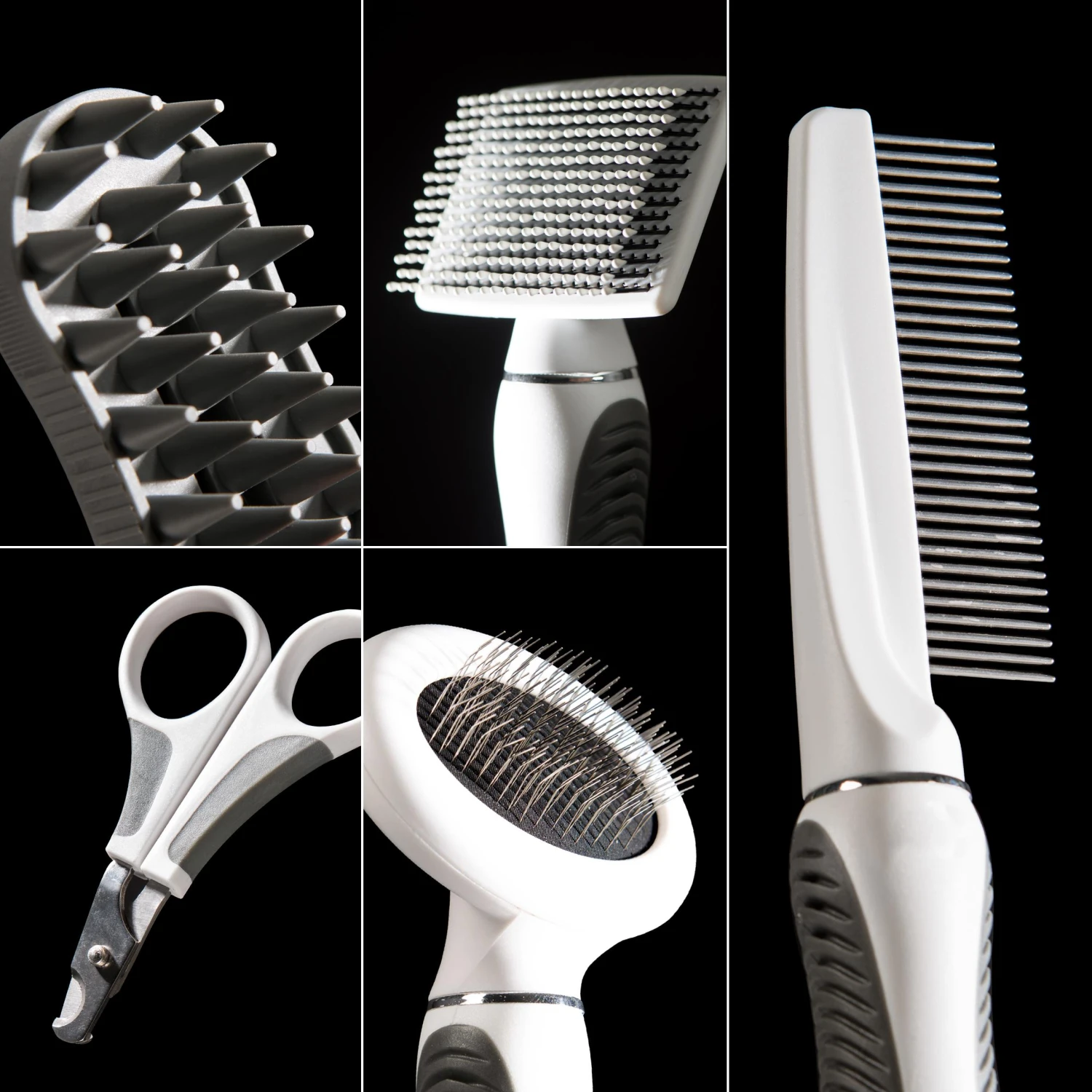 Contains every tool for daily grooming: nylon slicker brush, metal slicker brush, rubber palm brush, fine grooming comb, and curved nail clipper