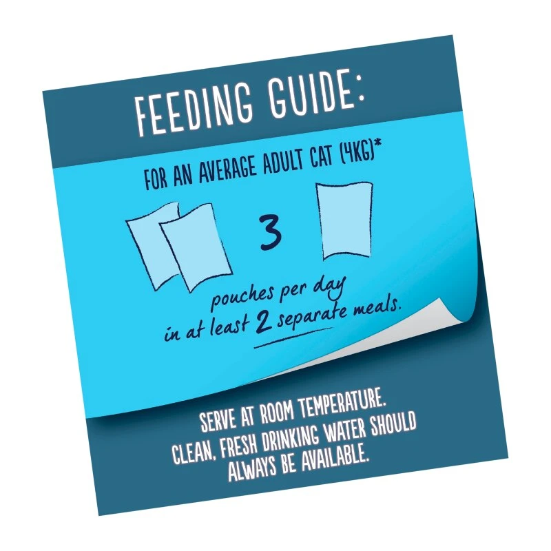 For an average adult cat (4kg), feed 3 to 4 pouches per day in at least 2 separate meals. The adult maintenance averages are based on moderately active cats at normal environmental temperatures. Individual needs vary and feeding should be adjusted as required to maintain your cat at a lean, healthy body weight. Serve at room temperature. Clean, fresh drinking water should always be available.