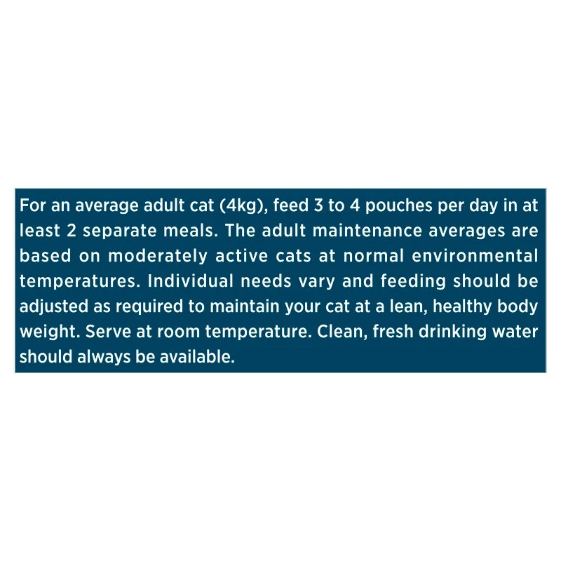Feeding guide: For an average adult cat (4kg), feed 3 to 4 pouches per day in at least 2 – 3 separate meals. The adult maintenance averages are based on moderately active cats at normal environmental temperatures. Individual needs vary and feeding should be adjusted as required to maintain your cat at a lean, healthy body weight. Serve at room temperature. Fresh clean drinking water should be always available.