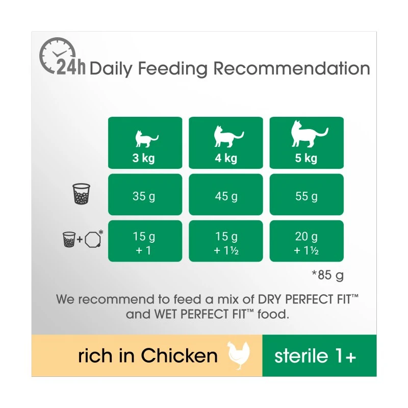 Perfect Fit Sterile 1+ Chicken cat food is specially formulated to support the specific needs of sterile cats: