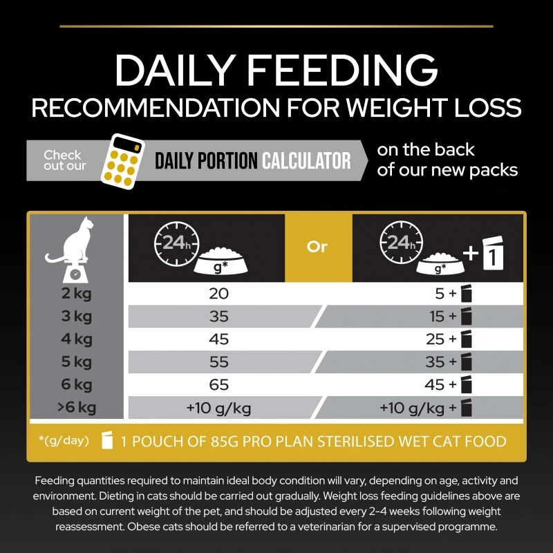 Cat Weight: 2-4 kg, Weight loss: 25-50 g, Maintenance: 35-65 g