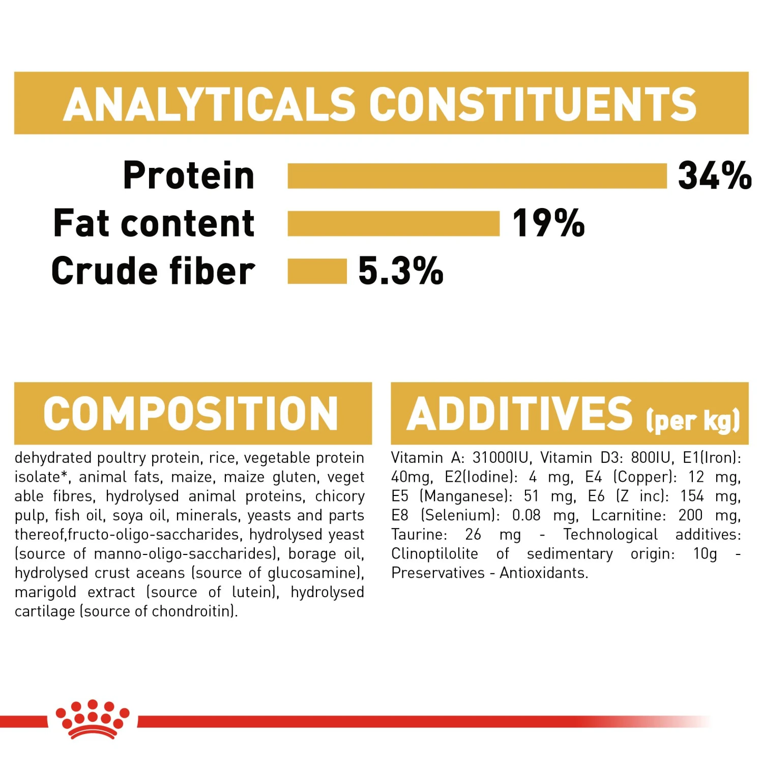 | Dehydrated poultry protein, rice, vegetable protein isolate*, animal fats, maize, maize gluten, vegetable fibres, hydrolysed animal proteins, chicory pulp, fish oil, soya oil, minerals, yeasts and parts thereof, fructo-oligo-saccharides, hydrolysed yeast (source of manno-oligo-saccharides), borage oil, hydrolysed crustaceans (source of glucosamine), marigold extract (source of lutein), hydrolysed cartilage (source of chondroitin). |