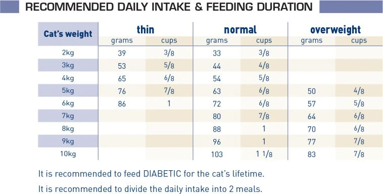 For cats with diabetes mellitus and between 2kg – 10kg.