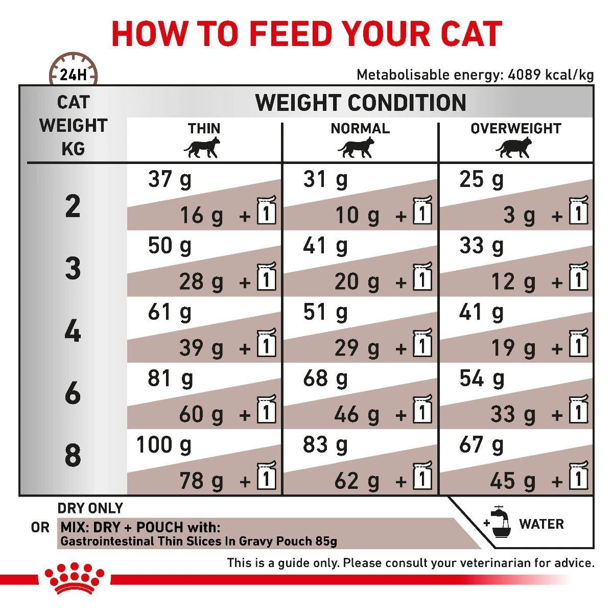 ROYAL CANIN® Gastrointestinal is specifically formulated to support the nutritional needs of cats with digestive sensitivities. This dry food product is available in either 2 kg or 4 kg bags. This formula contains high quality nutrients and an optimal balance of fibres to support healthy digestive transit. ROYAL CANIN® Gastrointestinal formula is highly palatable, even to cats with a decreased appetite. ROYAL CANIN® Gastrointestinal is formulated with a high energy content. This helps to reduce the volume of each meal, which decreases the intestinal load and makes digestion easier for your cat. If your cat is overweight or prone to weight gain, consider offering them ROYAL CANIN® Gastrointestinal Moderate Calorie that contains all of the benefits of their counterpart, just with fewer calories. As part of the ROYAL CANIN® Veterinary Health Nutrition range, it’s important that this product is only given to your pet when recommended by a veterinary professional. To cater to each cat’s individual preferences, ROYAL CANIN® Gastrointestinal is also available as wet food in gravy. If you’re considering mixed feeding, simply follow the on-pack feeding guidelines to ensure your cat gets an accurate amount of both wet and dry food for optimal benefit.