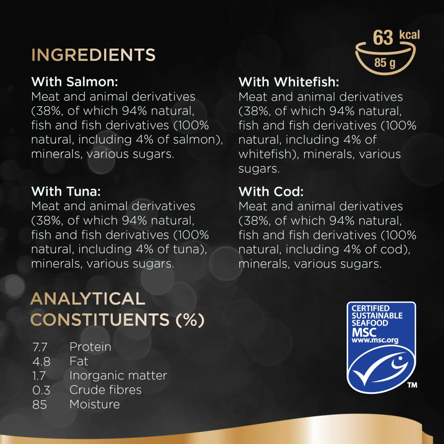 - Delicious Sheba cat food in jelly with Salmon, Whitefish, Tuna and Cod is made from select ingredients and certified sustainable fish
