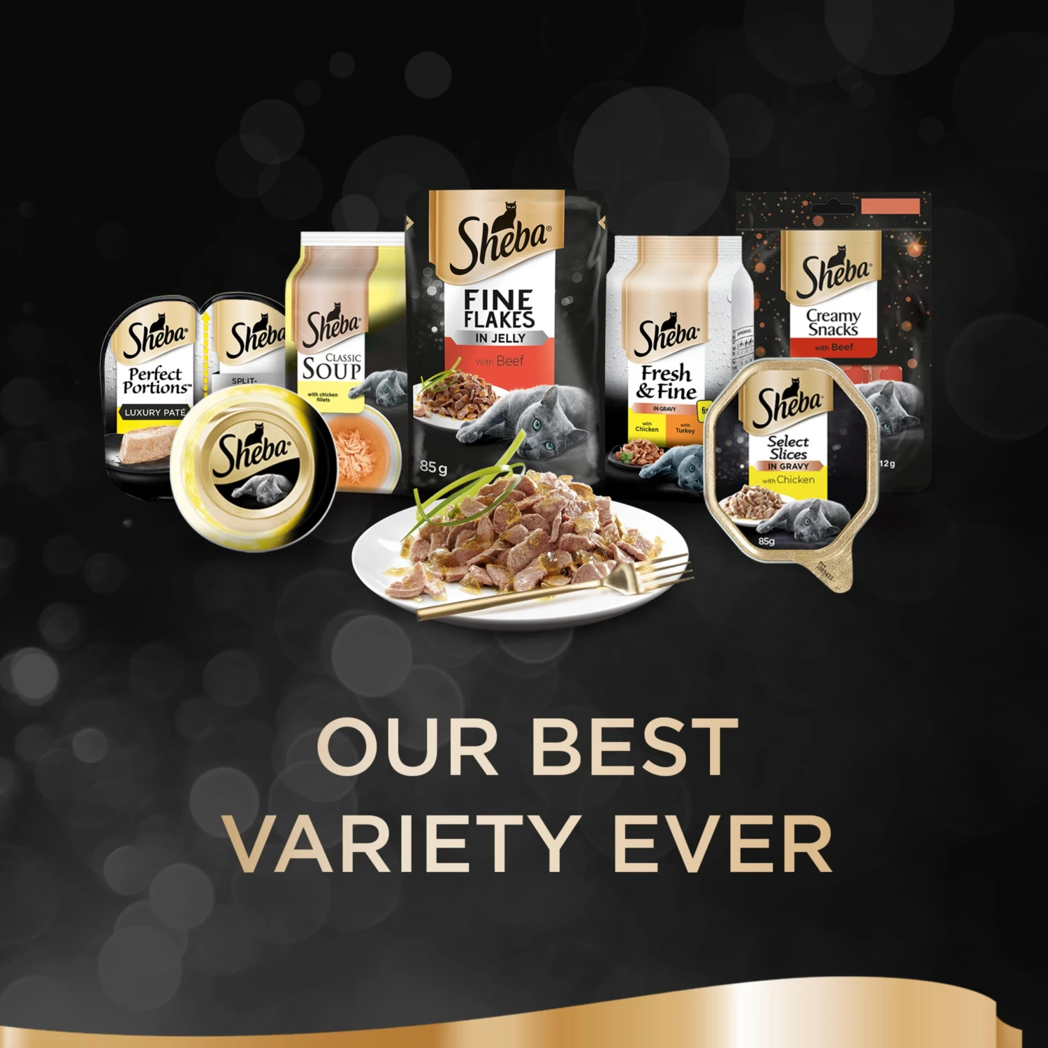 - Scrumptious flakes of Sheba wet cat food are carefully produced in a divine melting jelly