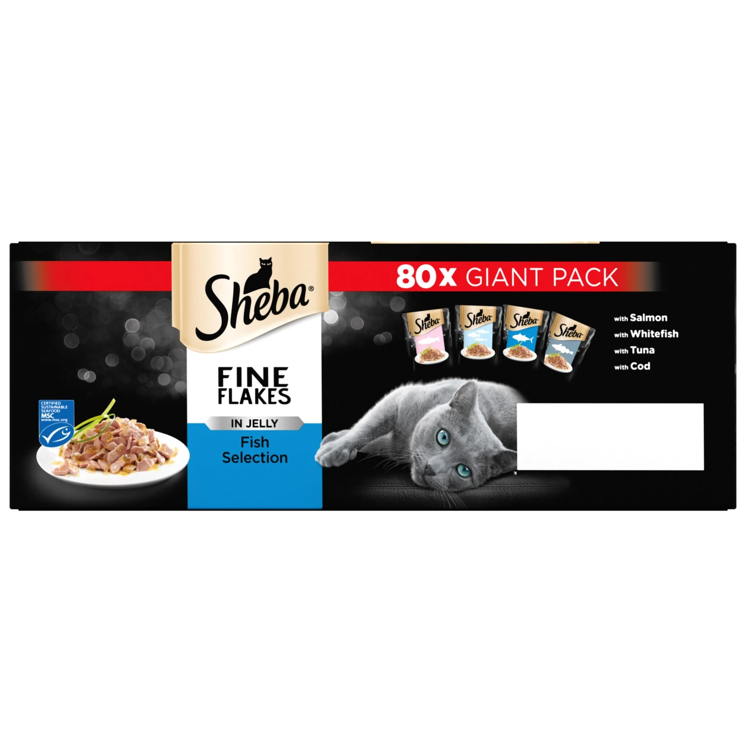 - Available in convenient 85g cat food pouches, Sheba Fine Flakes wet cat food with Fish in jelly is gently prepared, with an exquisite flavour that cats love, time and again