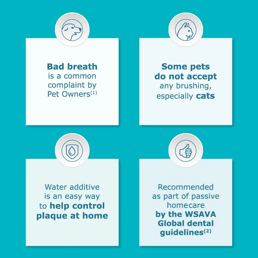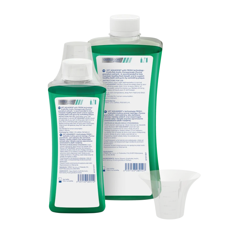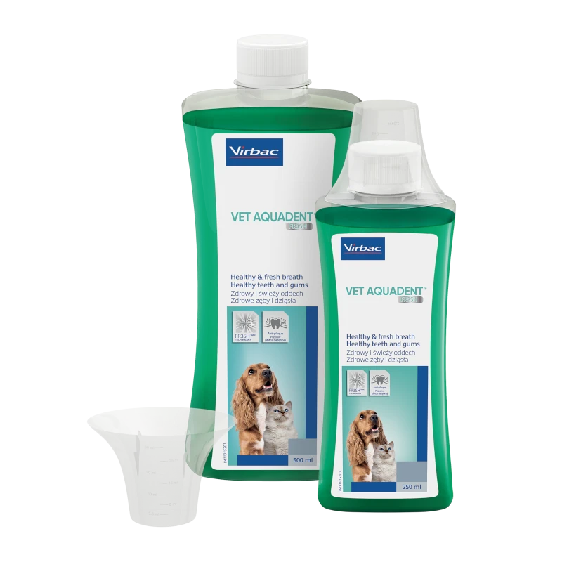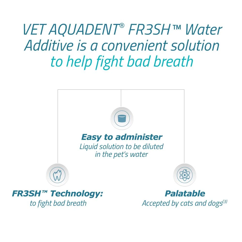 Vet Aquadent FR3SH is a highly palatable, easy to administer liquid solution, which is diluted directly into your pet’s water, making it an easy way to control plaque at home. Now featuring our innovative FR3SH Technology which is designed to help target the causes of halitosis in 3 ways – cleanses, cools and addresses the digestive causes of bad breath.