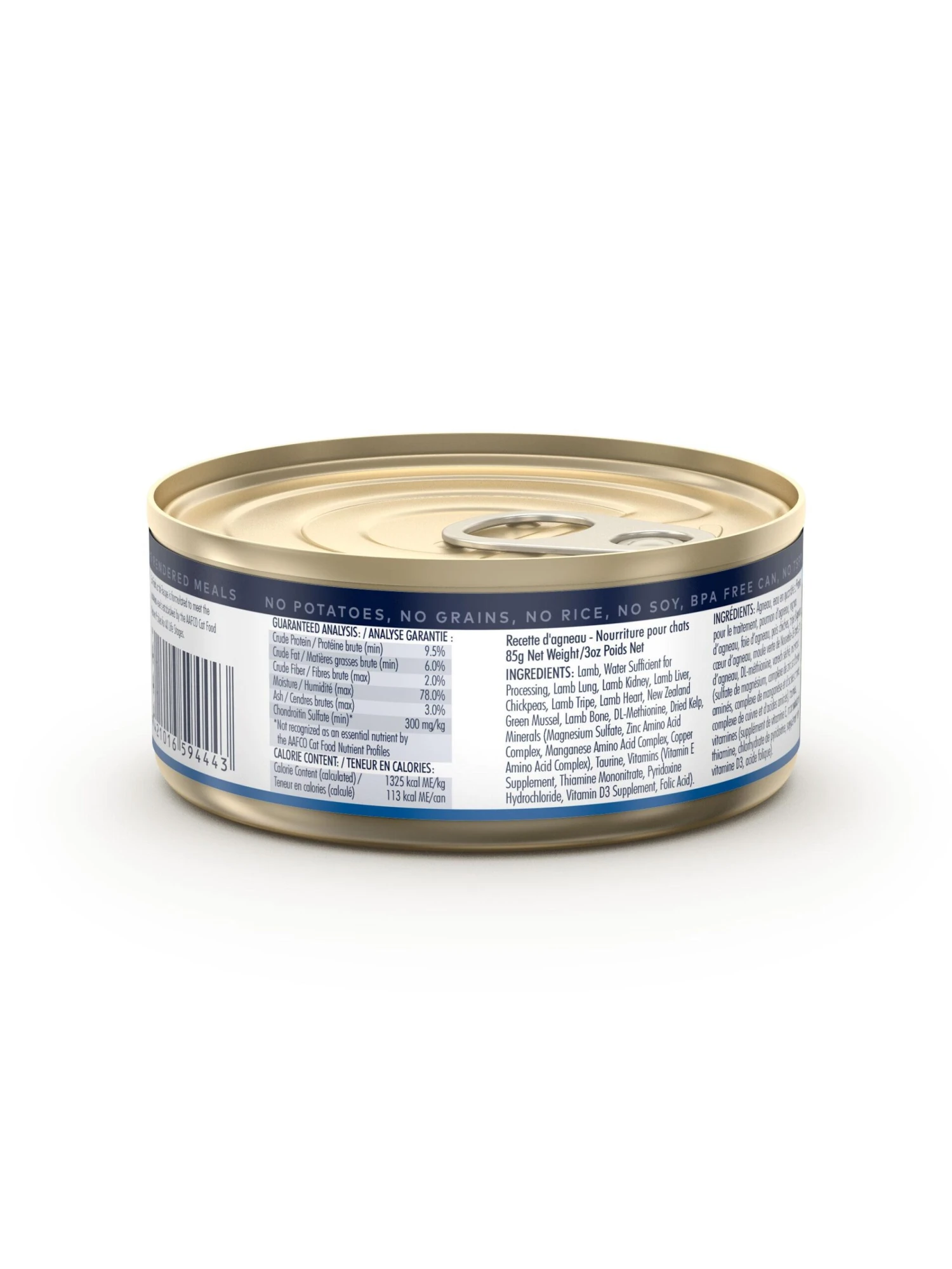 Lamb, Lamb Broth, Lamb Liver*, Lamb Lung*, Lamb Kidney*, Chick Peas, Lamb Tripe*, Lamb Heart*, New Zealand Green Mussel, Lamb Bone, Dried Kelp, Minerals (Zinc Amino Acid Complex, Copper Amino Acid Complex, Manganese Amino Acid Complex), Vitamins (Vitamin E Supplement, Vitamin B1 Supplement, Folic Acid, Vitamin D3 Supplement).